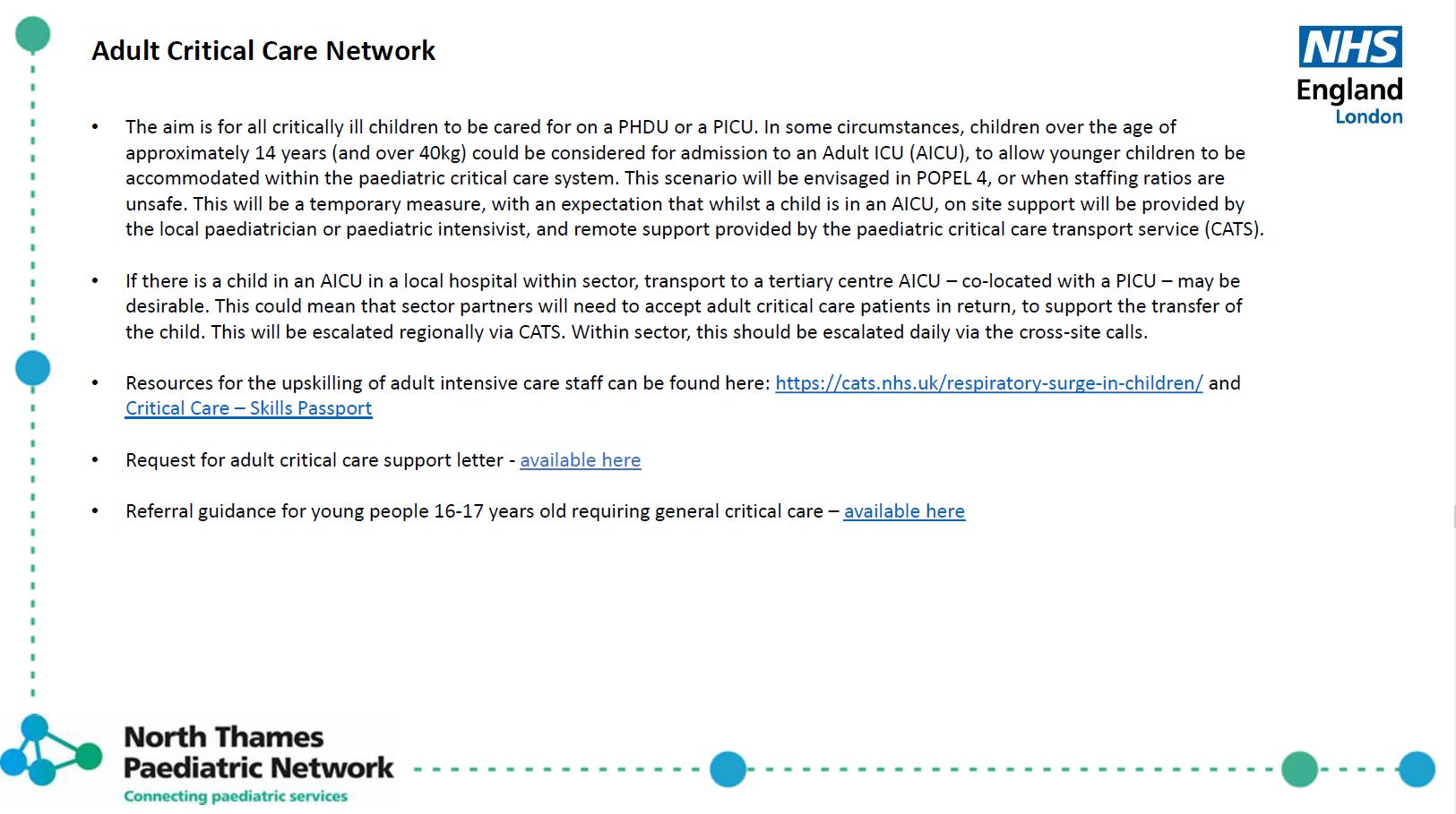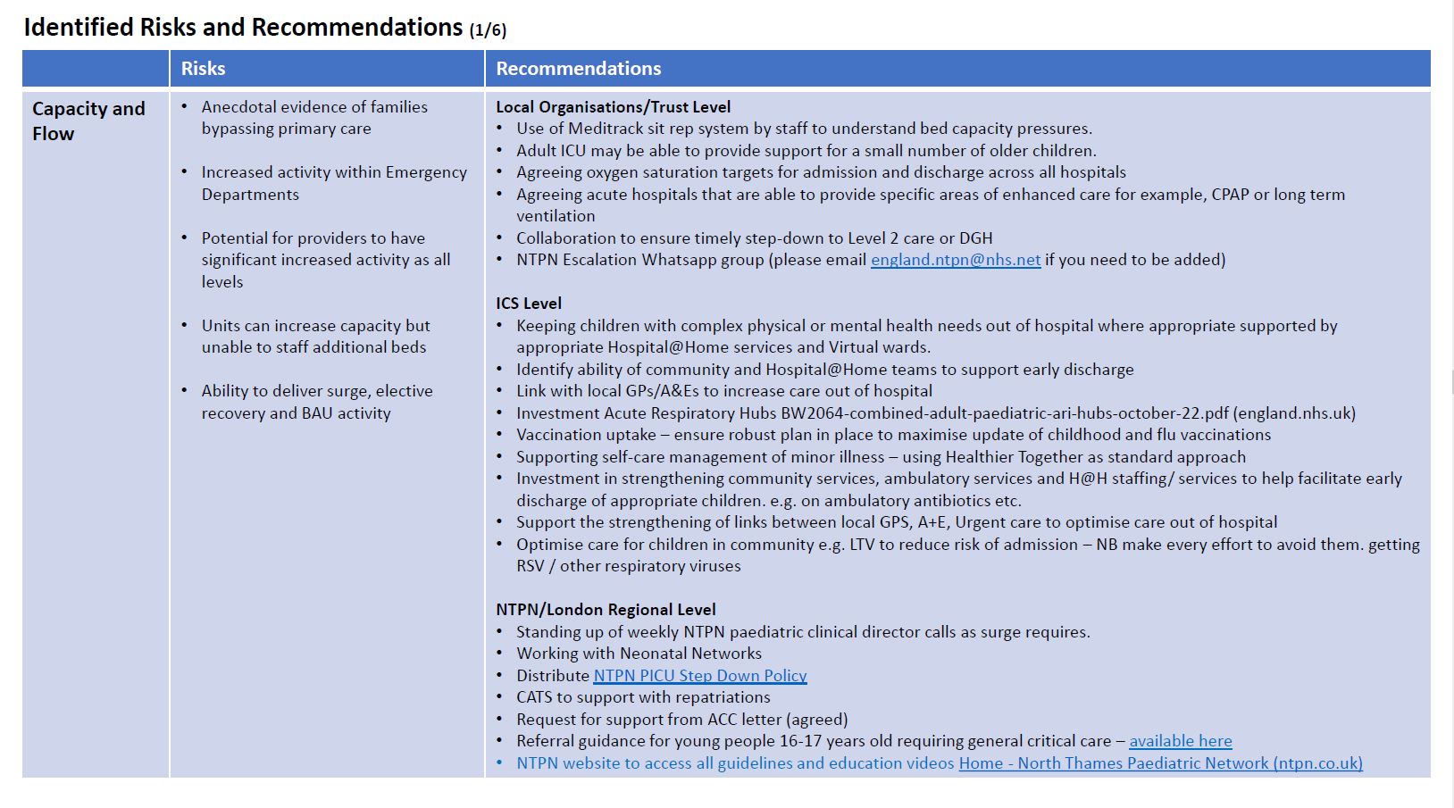 This is supplementary to the local provider and ICS level escalation plans and centres largely around Paediatric Intensive Care Capacity which is a regional resource and speciality bed capacity (e.g., Paediatric Surgery, Cardiac, Oncology) which is has multi-ICS pathways.